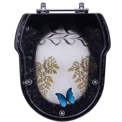 Tampa De Vaso Decorada Hampton Preto Para Louça Incepa Tampa De Vaso Hampton Decorada com Borboleta Azul e Avencas e, detalhe marmorizado Preto Para Louça Incepa é a escolha perfeita para seu banheiro. O Assento Sanitário Poliéster é considerado o melhor tipo de assentos sanitários do mercado pelo seu acabamento impecável e excelente durabilidade. Este assento de vaso sanitário Hampton Preto é produzido em resina maciça de poliéster. O poliéster é uma resina semelhante ao acrílico, só que mais robusta / resistente. Por isso, é totalmente impermeável, pode ser lavado com água à vontade. Fácil de limpar. Não acumula sujeira.