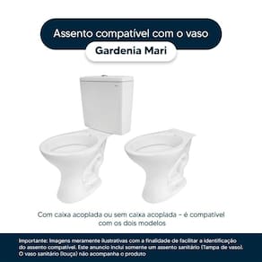 Detalhes e Cuidados Especiais: * Cor: Branco * Compatibilidade: Modelo Gardenia da marca Mari * Conteúdo da Embalagem: Assento sanitário, parafusos de fixação e instruções de instalação.