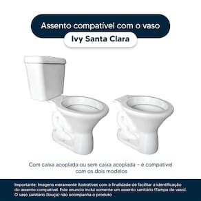 Detalhes e Cuidados Especiais: * Cor: Branco * Compatibilidade: Modelo Ivy da marca Santa Clara * Conteúdo da Embalagem: Assento sanitário, parafusos de fixação e instruções de instalação.