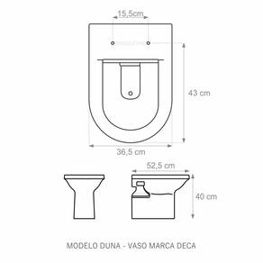 Assento Sanitário (tampa de vaso) fabricado em madeira MDF com pintura laqueada, com proteção raios UV, que garante excelente acabamento e durabilidade. Compatível com vasos (bacias/louças) sanitários com ou sem caixa acoplada. Tem calços de PVC instalados na tampa e no assento para proporcionar estabilidade ao uso, pois distribui o peso uniformemente sobre a louça sanitária. Montagem simples e fácil. Possui ferragem em alumínio anodizado que não enferruja/oxida e oferece muita resistência. O assento é acompanhado por parafusos para instalação. Embalagem dupla reforçada garante o recebimento do produto totalmente protegido. Especificações: - Dimensões da caixa: largura: 49,50cm. Altura: 4,00cm comprimento: 39,50cm - Peso do produto: 1,98kg - Acabamento: brilhante - Uso: este assento é adequado para uso na louça Deca modelo Duna - Garantia: 3 meses - Itens inclusos: Tampa e assento em MDF com calços de PVC, ferragem inoxidável, embalagem duplamente reforçada. Contém todos os parafusos e encaixes para instalação, sendo necessária somente uma chave de fenda para instalar o produto na louça sanitária. Instalação: posicione o produto, devidamente centralizado, em cima do vaso sanitário. Sem desmontar a ferragem, insira as buchas de borracha dentro dos furos da bacia sanitária. Encaixe os parafusos e posicione as porcas. Utilizando uma chave de fenda, aperte o parafuso no sentido horário até que o assento esteja firme e fixo no vaso. Manutenção: recomendamos a limpeza periódica com pano levemente umedecido com sabão neutro. Não usar esponjas abrasivas ou palha de aço nem qualquer tipo de produto químico.