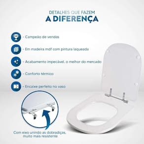 Itens inclusos: assento e tampa em madeira MDF com pintura laqueada. Ferragens metálicas em alumínio anodizado muito resistente, não oxidam e não enferrujam.