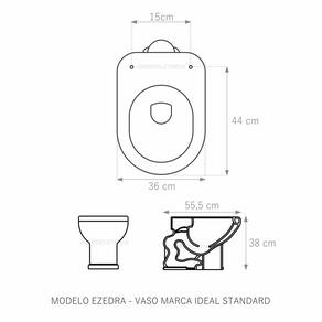 Assento Sanitário (tampa de vaso) fabricado em madeira MDF com pintura laqueada, com proteção raios UV, que garante excelente acabamento e durabilidade. Compatível com vasos (bacias/louças) sanitários com ou sem caixa acoplada. Tem calços de PVC instalados na tampa e no assento para proporcionar estabilidade ao uso, pois distribui o peso uniformemente sobre a louça sanitária. Montagem simples e fácil. Possui ferragem em alumínio anodizado que não enferruja/oxida e oferece muita resistência. O assento é acompanhado por parafusos para instalação. Embalagem dupla reforçada garante o recebimento do produto totalmente protegido. Especificações: - Dimensões da caixa: largura: 49,50cm. Altura: 4,00cm comprimento: 39,50cm - Peso do produto: 1,98kg - Acabamento: brilhante - Uso: este assento é adequado para uso na louça Ideal Standard modelo Ezedra - Garantia: 3 meses - Itens inclusos: Tampa e assento em MDF com calços de PVC, ferragem inoxidável, embalagem duplamente reforçada. Contém todos os parafusos e encaixes para instalação, sendo necessária somente uma chave de fenda para instalar o produto na louça sanitária. Instalação: posicione o produto, devidamente centralizado, em cima do vaso sanitário. Sem desmontar a ferragem, insira as buchas de borracha dentro dos furos da bacia sanitária. Encaixe os parafusos e posicione as porcas. Utilizando uma chave de fenda, aperte o parafuso no sentido horário até que o assento esteja firme e fixo no vaso. Manutenção: recomendamos a limpeza periódica com pano levemente umedecido com sabão neutro. Não usar esponjas abrasivas ou palha de aço nem qualquer tipo de produto químico.