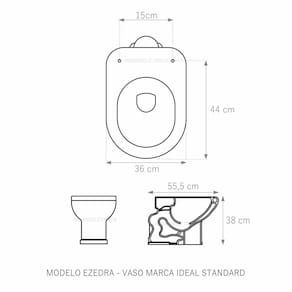 Assento Sanitário (tampa de vaso) fabricado em madeira MDF com pintura laqueada, com proteção raios UV, que garante excelente acabamento e durabilidade. Compatível com vasos (bacias/louças) sanitários com ou sem caixa acoplada. Tem calços de PVC instalados na tampa e no assento para proporcionar estabilidade ao uso, pois distribui o peso uniformemente sobre a louça sanitária. Montagem simples e fácil. Possui ferragem em alumínio anodizado que não enferruja/oxida e oferece muita resistência. O assento é acompanhado por parafusos para instalação. Embalagem dupla reforçada garante o recebimento do produto totalmente protegido. Especificações: - Dimensões da caixa: largura: 49,50cm. Altura: 4,00cm comprimento: 39,50cm - Peso do produto: 1,98kg - Acabamento: brilhante - Uso: este assento é adequado para uso na louça Ideal Standard modelo Ezedra - Garantia: 3 meses - Itens inclusos: Tampa e assento em MDF com calços de PVC, ferragem inoxidável, embalagem duplamente reforçada. Contém todos os parafusos e encaixes para instalação, sendo necessária somente uma chave de fenda para instalar o produto na louça sanitária. Instalação: posicione o produto, devidamente centralizado, em cima do vaso sanitário. Sem desmontar a ferragem, insira as buchas de borracha dentro dos furos da bacia sanitária. Encaixe os parafusos e posicione as porcas. Utilizando uma chave de fenda, aperte o parafuso no sentido horário até que o assento esteja firme e fixo no vaso. Manutenção: recomendamos a limpeza periódica com pano levemente umedecido com sabão neutro. Não usar esponjas abrasivas ou palha de aço nem qualquer tipo de produto químico.
