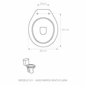 Assento Sanitário (tampa de vaso) fabricado em madeira MDF com pintura laqueada, com proteção raios UV, que garante excelente acabamento e durabilidade. Compatível com vasos (bacias/louças) sanitários com ou sem caixa acoplada. Tem calços de PVC instalados na tampa e no assento para proporcionar estabilidade ao uso, pois distribui o peso uniformemente sobre a louça sanitária. Montagem simples e fácil. Possui ferragem em alumínio anodizado que não enferruja/oxida e oferece muita resistência. O assento é acompanhado por parafusos para instalação. Embalagem dupla reforçada garante o recebimento do produto totalmente protegido. Especificações: - Dimensões da caixa: largura: 51,50cm. Altura: 4,00cm comprimento: 38,00cm - Peso do produto: 1,98kg - Acabamento: brilhante - Uso: este assento é adequado para uso na louça Santa Clara de modelo Ivy - Garantia: 3 meses - Itens inclusos: Tampa e assento com calços de PVC, ferragem inoxidável, embalagem duplamente reforçada. Contém todos os parafusos e encaixes para instalação, sendo necessária somente uma chave de fenda para instalar o produto na louça sanitária. Instalação: posicione o produto, devidamente centralizado, em cima do vaso sanitário. Sem desmontar a ferragem, insira as buchas de borracha dentro dos furos da bacia sanitária. Utilizando uma chave de fenda, aperte o parafuso no sentido horário até que o assento esteja firme no vaso. Manutenção: recomendamos a limpeza periódica com pano levemente umedecido com sabão neutro. Não usar esponjas abrasivas ou palha de aço nem qualquer tipo de produto químico.