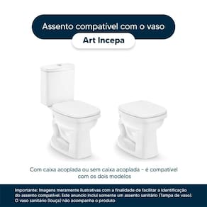 Instalação Simples e Rápida: Com todos os parafusos e componentes necessários inclusos, a instalação é rápida e descomplicada. Seu novo assento estará pronto para uso em questão de minutos. Desenvolvido especificamente para o modelo Art da marca Incepa, com ou sem caixa acoplada, proporciona um encaixe perfeito, oferecendo estabilidade e conforto durante o uso.