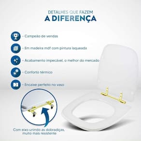 Durabilidade e Resistência: Fabricado em MDF com camadas de pintura laqueada, este assento oferece não apenas beleza, mas também conforto térmico e alta resistência. Seu acabamento impecável adiciona um toque de classe ao seu banheiro.