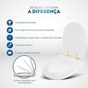 Itens inclusos: assento e tampa em madeira MDF com pintura laqueada. Ferragens na cor Dourada em alumínio anodizado muito resistente, não oxidam e não enferrujam.