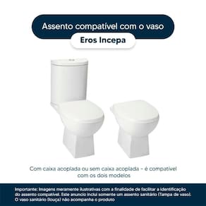 Instalação Simples e Rápida: Com todos os parafusos e componentes necessários inclusos, a instalação é rápida e descomplicada. Seu novo assento estará pronto para uso em questão de minutos. Desenvolvido especificamente para o modelo Eros da marca Incepa, com ou sem caixa acoplada, proporciona um encaixe perfeito, oferecendo estabilidade e conforto durante o uso.