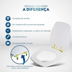 Durabilidade e Resistência: Fabricado em MDF com camadas de pintura laqueada, este assento oferece não apenas beleza, mas também conforto térmico e alta resistência. Seu acabamento impecável adiciona um toque de classe ao seu banheiro.