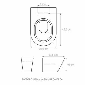 Assento Sanitário (tampa de vaso) fabricado em madeira MDF com pintura laqueada, com proteção raios UV, que garante excelente acabamento e durabilidade. Compatível com vasos (bacias/louças) sanitários com ou sem caixa acoplada. Tem calços de PVC instalados na tampa e no assento para proporcionar estabilidade ao uso, pois distribui o peso uniformemente sobre a louça sanitária. Montagem simples e fácil. Possui ferragem em alumínio anodizado que não enferruja/oxida e oferece muita resistência. O assento é acompanhado por parafusos para instalação. Embalagem dupla reforçada garante o recebimento do produto totalmente protegido. Especificações: - Dimensões da caixa: largura: 49,50cm. Altura: 4,00cm comprimento: 39,50cm - Peso do produto: 1,98kg - Acabamento: brilhante - Uso: este assento é adequado para uso na louça Deca modelo Link - Garantia: 3 meses - Itens inclusos: Tampa e assento em MDF com calços de PVC, ferragem inoxidável, embalagem duplamente reforçada. Contém todos os parafusos e encaixes para instalação, sendo necessária somente uma chave de fenda para instalar o produto na louça sanitária. Instalação: posicione o produto, devidamente centralizado, em cima do vaso sanitário. Sem desmontar a ferragem, insira as buchas de borracha dentro dos furos da bacia sanitária. Encaixe os parafusos e posicione as porcas. Utilizando uma chave de fenda, aperte o parafuso no sentido horário até que o assento esteja firme e fixo no vaso. Manutenção: recomendamos a limpeza periódica com pano levemente umedecido com sabão neutro. Não usar esponjas abrasivas ou palha de aço nem qualquer tipo de produto químico.