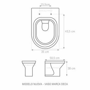 Assento Sanitário (tampa de vaso) fabricado em madeira MDF com pintura laqueada, com proteção raios UV, que garante excelente acabamento e durabilidade. Compatível com vasos (bacias/louças) sanitários com ou sem caixa acoplada. Tem calços de PVC instalados na tampa e no assento para proporcionar estabilidade ao uso, pois distribui o peso uniformemente sobre a louça sanitária. Montagem simples e fácil. Possui ferragem em alumínio anodizado que não enferruja/oxida e oferece muita resistência. O assento é acompanhado por parafusos para instalação. Embalagem dupla reforçada garante o recebimento do produto totalmente protegido. Especificações: - Dimensões da caixa: largura: 49,50cm. Altura: 4,00cm comprimento: 39,50cm - Peso do produto: 1,98kg - Acabamento: brilhante - Uso: este assento é adequado para uso na louça Deca modelo Nuova - Garantia: 3 meses - Itens inclusos: Tampa e assento em MDF com calços de PVC, ferragem inoxidável, embalagem duplamente reforçada. Contém todos os parafusos e encaixes para instalação, sendo necessária somente uma chave de fenda para instalar o produto na louça sanitária. Instalação: posicione o produto, devidamente centralizado, em cima do vaso sanitário. Sem desmontar a ferragem, insira as buchas de borracha dentro dos furos da bacia sanitária. Encaixe os parafusos e posicione as porcas. Utilizando uma chave de fenda, aperte o parafuso no sentido horário até que o assento esteja firme e fixo no vaso. Manutenção: recomendamos a limpeza periódica com pano levemente umedecido com sabão neutro. Não usar esponjas abrasivas ou palha de aço nem qualquer tipo de produto químico.