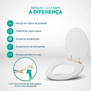 Durabilidade e Resistência: Fabricado em resina maciça de poliéster, este assento sanitário é altamente resistente e totalmente impermeável.