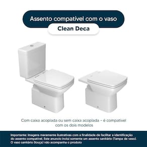 Detalhes e Cuidados Especiais: * Cor: Branco * Compatibilidade: Modelo Clean da marca Deca * Conteúdo da Embalagem: Assento sanitário, parafusos de fixação e instruções de instalação. * Fabricante do Assento Sanitário: Pontto Lavabo.
