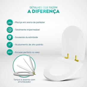 Tampa De Vaso Poliéster Com Amortecedor Smart Onix (preto Fosco) Para Bacia Celite Com Ferragem Dourada Dê um toque de elegância e modernidade ao seu banheiro com a Tampa de Vaso Poliéster Com Amortecedor Smart Onix (Preto Fosco) para Bacia Celite com Ferragem Dourada. Com seu sistema exclusivo de fechamento suave, seguindo as últimas tendências em decoração, proporciona uma experiência moderna e funcional. Feche Suavemente com Sofisticação: O sistema soft close é um diferencial notável deste assento. Composto por dois amortecedores, um para a tampa e outro para o assento, eles garantem um fechamento suave, evitando batidas indesejadas. Isso significa que a tampa e o assento descerão lentamente quando soltos (sem bater).