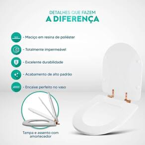 Durabilidade e Resistência: Fabricado em resina maciça de poliéster, este assento sanitário é altamente resistente e totalmente impermeável.