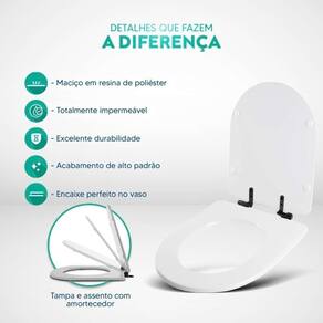 Durabilidade e Resistência: Fabricado em resina maciça de poliéster, este assento sanitário é altamente resistente e totalmente impermeável.