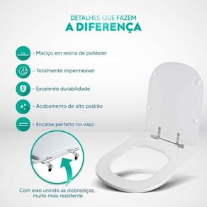 Durabilidade e Resistência: Fabricado em resina maciça de poliéster, este assento sanitário é altamente resistente e totalmente impermeável.