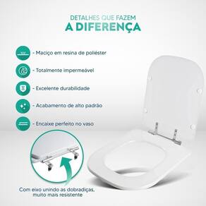 Limpeza: recomenda-se a limpeza do assento sanitário poliéster com água e sabão neutro, não utilizar produtos abrasivos.