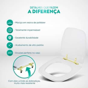 Durabilidade e Resistência: Fabricado em resina maciça de poliéster, este assento sanitário é altamente resistente e totalmente impermeável.
