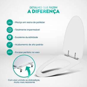 Durabilidade e Resistência: Fabricado em resina maciça de poliéster, este assento sanitário é altamente resistente e totalmente impermeável.