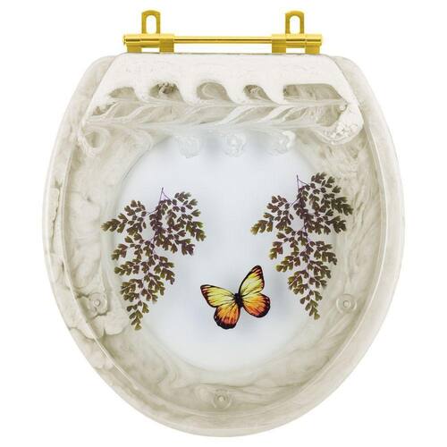 Tampa de Vaso Sanitário Poliéster Oval Bege Decorado Borboleta Amarela para bacia Deca Com Ferragem Dourada. Conforto, qualidade e elegância para o seu banheiro. Esta Tampa de Vaso é maciça em Resina de Poliéster, muito resistente e totalmente à prova de água.