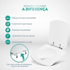 Durabilidade e Resistência: Fabricado em resina maciça de poliéster, este assento sanitário é altamente resistente e totalmente impermeável.