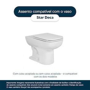 Detalhes e Cuidados Especiais: * Cor: Branco * Compatibilidade: Modelo Star da marca Deca * Conteúdo da Embalagem: Assento sanitário, parafusos de fixação e instruções de instalação. * Fabricante do Assento Sanitário: Pontto Lavabo.