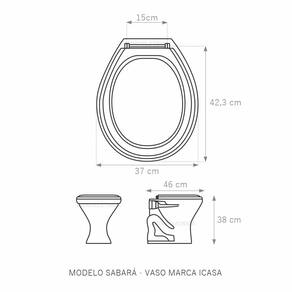 Assento Sanitário (tampa de vaso) fabricado em madeira MDF com pintura laqueada, com proteção raios UV, que garante excelente acabamento e durabilidade. Compatível com vasos (bacias/louças) sanitários com ou sem caixa acoplada. Tem calços de PVC instalados na tampa e no assento para proporcionar estabilidade ao uso, pois distribui o peso uniformemente sobre a louça sanitária. Montagem simples e fácil. Possui ferragem em alumínio anodizado que não enferruja/oxida e oferece muita resistência. O assento é acompanhado por parafusos para instalação. Embalagem dupla reforçada garante o recebimento do produto totalmente protegido. Especificações: - Dimensões da caixa: largura: 51,50cm. Altura: 4,00cm comprimento: 38,00cm - Peso do produto: 1,98kg - Acabamento: brilhante - Uso: este assento é adequado para uso na louça Icasa de modelo Sabara - Garantia: 3 meses - Itens inclusos: Tampa e assento com calços de PVC, ferragem inoxidável, embalagem duplamente reforçada. Contém todos os parafusos e encaixes para instalação, sendo necessária somente uma chave de fenda para instalar o produto na louça sanitária. Instalação: posicione o produto, devidamente centralizado, em cima do vaso sanitário. Sem desmontar a ferragem, insira as buchas de borracha dentro dos furos da bacia sanitária. Utilizando uma chave de fenda, aperte o parafuso no sentido horário até que o assento esteja firme no vaso. Manutenção: recomendamos a limpeza periódica com pano levemente umedecido com sabão neutro. Não usar esponjas abrasivas ou palha de aço nem qualquer tipo de produto químico.