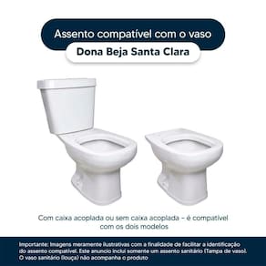 Detalhes e Cuidados Especiais: * Cor: Bege Claro * Compatibilidade: Modelo Dona Beja da marca Santa Clara * Conteúdo da Embalagem: Assento sanitário, parafusos de fixação e instruções de instalação.