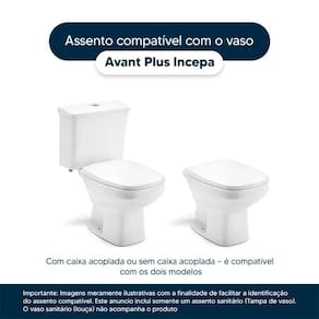 Detalhes e Cuidados Especiais: * Cor: Branco * Compatibilidade: Modelo Avant da marca Incepa * Conteúdo da Embalagem: Assento sanitário, parafusos de fixação e instruções de instalação. * Fabricante do Assento Sanitário: Pontto Lavabo.