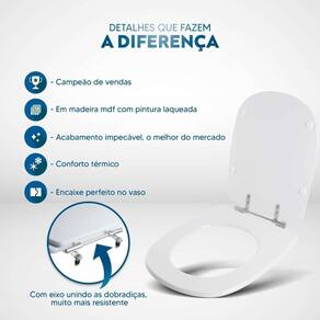 Durabilidade e Resistência: Fabricado em MDF com camadas de pintura laqueada, este assento oferece não apenas beleza, mas também conforto térmico e alta resistência. Seu acabamento impecável adiciona um toque de classe ao seu banheiro.