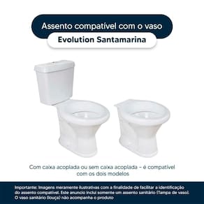 Detalhes e Cuidados Especiais: * Cor: Preto * Compatibilidade: Modelo Evolution da marca Santamarina * Conteúdo da Embalagem: Assento sanitário, parafusos de fixação e instruções de instalação. * Fabricante do Assento Sanitário: Pontto Lavabo.