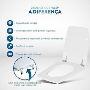 Durabilidade e Resistência: Fabricado em MDF com camadas de pintura laqueada, este assento oferece não apenas beleza, mas também conforto térmico e alta resistência. Seu acabamento impecável adiciona um toque de classe ao seu banheiro.