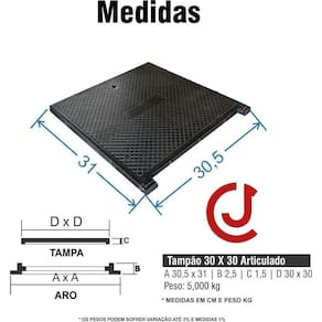 Tampa Esgoto Calçada Elétrica Gordura 30X30 Ferro Articulada Especificações do produto Características técnicas: projetado para tampar, caixas de passagem de tubulação, esgoto, águas pluviais, água potável, redes de telecomunicações, eletricidade entre outros. Facilitando o acesso a válvulas, registros, quadro de distribuição. Produto Nome: tampão 30x30 articulado ferro. Indicação: caixas de passagem. Material: ferro fundido. Acabamento: pintura cor preta esmalte sintético . Modelo: esgoto Garantia: 30 dias contra defeito de fabricação Peso: 4,500 kg Carga máxima nominal por eixo: 300 kg Suporta passagem de veículos leves em áreas de trafego baixo exemplo garagem e calçada. Marca: Casa E Jardim Comércio