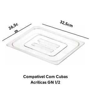 ### Características Técnicas: - **Material**: Acrílico (Policarbonato) - **Dimensões**: 32,5 cm x 26,5 cm (L x C) - **Compatibilidade**: Desenvolvida para a Cuba Gastronômica GN 1/2