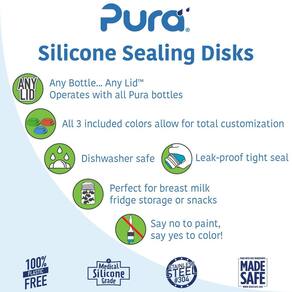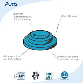 - UMA GARRAFA, UMA VIDA: permite que qualquer garrafa Pura seja usada como recipiente para lanches, garrafa de armazenamento para leite ou garrafa de água reaproveitada, pois os discos de vedação de silicone Kiki podem substituir qualquer tampa de silicone Pura!