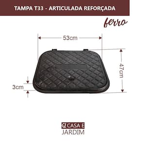 Tampa T33 Ferro Articulada Elétrica Caixa Esgoto 47x53 CJ Características técnicas: projetado para tampar, caixas de passagem de tubulação, esgoto, águas pluviais, água potável, redes de telecomunicações, eletricidade entre outros. Facilitando o acesso a válvulas, registros, quadro de distribuição. Produto Nome: tampão t33 ferro Articulado Medidas externas: 47 x 53cm Indicação: caixas de passagem, calçada, elétrica. Material: ferro fundido. Acabamento: pintura cor preta esmalte sintético . Modelo: Articulado Garantia: 30 dias contra defeito de fabricação. Peso: 12,300kg Carga máxima nominal por eixo: 300 kg Suporta passagem de veículos leves em áreas de trafego baixo exemplo garagem e calçada. Temos uma linha completa em tampas de ferro e pvc para construção como, tampões para proteger caixas de passagem, tampa de esgoto, tampa de águas pluviais, tampa de ferro fundido tampa de água potável, tampa para calçada, tampa de ferro elétrica, entre outros. Marca: Casa E Jardim Comércio