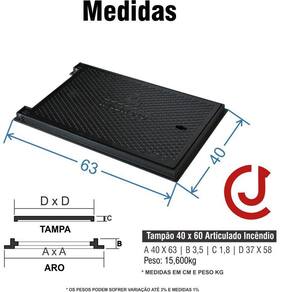 Tampa Tampão De Incêndio Hidrante Recalque 40 X 60 Ferro PRODUTO Nome: Tampão 40x60 Incêndio Articulado ESPECIFICAÇÕES DO PRODUTO Características Técnicas: Projetado para tampar, caixas de passagem de tubulação, esgoto, águas pluviais, água potável, redes de telecomunicações, eletricidade entre outros. Mais indicado o uso para tampar válvula de incêndio com descrição na tampa. Indicação: Registro de recalque. Material: Ferro fundido. Acabamento: Pintura cor preto Modelo: Tampão articulado para recalque de incêndio. : 30 dias contra defeito de fabricação Peso: 15,600 kg Carga máxima nominal por eixo: 400 kg Suporta passagem de veículos leves em áreas de trafego baixo exemplo garagem e calçada. Marca: Não Informado