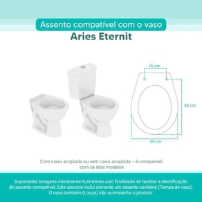 OBS.: O código 6LPF gravado na louça sanitária corresponde ao fluxo de água de uma descarga e não indica o modelo da mesma. RBN: Casa/Banho/Instalações e Acessórios de Banheiro/Vasos Sanitários e Peças/Assento de Vaso Sanitário | Conteúdo da Embalagem: 01 Assento Sanitário | Tipo: Assento Sanitário | Produto: Assento Sanitário | Site do Fabricante: www.ponttolavabo.com.br/ | Marca do Assento Sanitário: Pontto Lavabo | Garantia: 6 meses contra defeitos de fabricação | Dica: Instalação: sem desmontar o produto, posicione sobre o vaso sanitário e encaixe os dois parafusos com as borrachas pretas dentro do furo do vaso. Aperte com a chave de fenda no sentido horário até ficar firme. | Para Vaso Sanitário do Modelo: Aries | Para vaso Sanitário da Marca: Eternit | Cor: Branco | Tonalidade: Branco | Material do Assento Sanitário: MDF Laqueado | Instruções de Limpeza: Recomenda-se a limpeza com pano úmido e sabão neutro, não utilizar produtos abrasivos ou químicos | Almofadado?: Não | Peso do Produto: 1.98 | Tipo de Fechamento: Fechamento Comum | Material da Fixação: Alumínio Anodizado | Precisa de baterias ou pilhas: Não | Regulamentações aplicáveis a produtos perigosos: Não se aplica | Código de certificação: Não se aplica Ean: 7899983693315