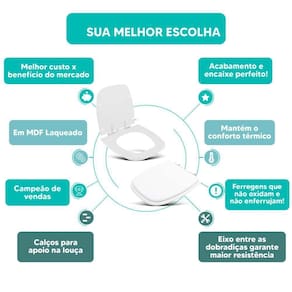 DIFERENCIAL * Possui calços que evitam o contato direto com a louça e que o assento deslize lateralmente. * Proporcionam maior estabilidade durante o uso. * Acabamento e encaixe perfeito no vaso sanitário. * Possui eixo entre as dobradiças, mantendo o assento sanitário firme na louça. * Sua ferragem metálica é super resistente e não oxida e nem enferruja.