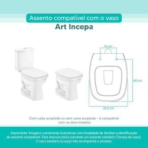 OBS.: O código 6LPF gravado na louça sanitária corresponde ao fluxo de água de uma descarga e não indica o modelo da mesma. RBN: Casa/Banho/Instalações e Acessórios de Banheiro/Vasos Sanitários e Peças/Assento de Vaso Sanitário | Conteúdo da Embalagem: 01 Assento Sanitário | Tipo: Assento Sanitário | Produto: Assento Sanitário | Site do Fabricante: | Marca do Assento Sanitário: Pontto Lavabo | : 6 meses contra defeitos de fabricação | Dica: Instalação: sem desmontar o produto, posicione sobre o vaso sanitário e encaixe os dois parafusos com as borrachas pretas dentro do furo do vaso. Aperte com a chave de fenda no sentido horário até ficar firme. | Para Vaso Sanitário do Modelo: Art | Para vaso Sanitário da Marca: Incepa | Cor: Branco | Tonalidade: Branco | Material do Assento Sanitário: MDF Laqueado | Instruções de Limpeza: Recomenda-se a limpeza com pano úmido e sabão neutro, não utilizar produtos abrasivos ou químicos | Almofadado?: Não | Peso do Produto: | Tipo de Fechamento: Fechamento Comum | Material da Fixação: Alumínio Anodizado | Precisa de baterias ou pilhas: Não | Regulamentações aplicáveis a produtos perigosos: Não aplicável | Código de certificação: Não aplicável | Ponto de Destaque01: Produzido em MDF Laqueado | Ponto de Destaque02: Ferragem em Alumínio Anodizado (não enferruja, não oxida) | Ponto de Destaque03: Possui 15cm de distância entre furos | Ponto de Destaque04: Produto vai completo, fácil instalação | Ponto de Destaque05: Pontto Lavabo | Termos de Pesquisa01: Assento Sanitário; Tampa de Vaso Sanitário; Art Branco Incepa; Art 6lpf; Incepa 6lpf | Quantidade de itens: 1 | Fonte de energia: Não aplicável | Dimensões da embalagem: Altura: 5cm x Largura: 40cm x Comprimento: 50cm | de caixas: 1