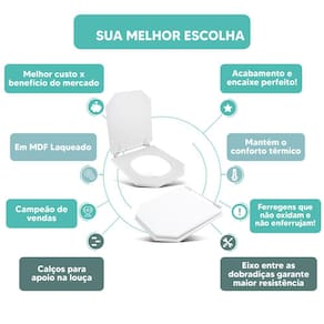 MATERIAL * Fabricado em madeira MDF com Pintura Laqueada na cor Branco * Mantém o conforto térmico do assento sanitário.