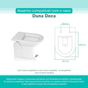 OBS.: O código 6LPF gravado na louça sanitária corresponde ao fluxo de água de uma descarga e não indica o modelo da mesma. RBN: Casa/Banho/Instalações e Acessórios de Banheiro/Vasos Sanitários e Peças/Assento de Vaso Sanitário | Conteúdo da Embalagem: 01 Assento Sanitário | Tipo: Assento Sanitário | Produto: Assento Sanitário | Site do Fabricante: | Marca do Assento Sanitário: Pontto Lavabo | : 6 meses contra defeitos de fabricação | Dica: Instalação: sem desmontar o produto, posicione sobre o vaso sanitário e encaixe os dois parafusos com as borrachas pretas dentro do furo do vaso. Aperte com a chave de fenda no sentido horário até ficar firme. | Para Vaso Sanitário do Modelo: Duna | Para vaso Sanitário da Marca: Deca | Cor: Branco | Tonalidade: Branco | Material do Assento Sanitário: MDF Laqueado | Instruções de Limpeza: Recomenda-se a limpeza com pano úmido e sabão neutro, não utilizar produtos abrasivos ou químicos | Almofadado?: Não | Peso do Produto: | Tipo de Fechamento: Fechamento Comum | Material da Fixação: Alumínio Anodizado | Precisa de baterias ou pilhas: Não | Regulamentações aplicáveis a produtos perigosos: Não aplicável | Código de certificação: Não aplicável | Ponto de Destaque01: Produzido em MDF Laqueado | Ponto de Destaque02: Ferragem em Alumínio Anodizado (não enferruja, não oxida) | Ponto de Destaque03: Possui 15,5cm de distância entre furos | Ponto de Destaque04: Produto vai completo, fácil instalação | Ponto de Destaque05: Pontto Lavabo | Termos de Pesquisa01: Assento Sanitário; Tampa de Vaso Sanitário; Duna Branco Deca; Duna 6lpf; Deca 6lpf | Quantidade de itens: 1 | Fonte de energia: Não aplicável | Dimensões da embalagem: Altura: 5cm x Largura: 40cm x Comprimento: 50cm | de caixas: 1