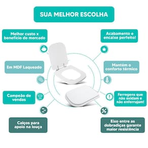 MATERIAL * Fabricado em madeira MDF com Pintura Laqueada na cor Branco * Mantém o conforto térmico do assento sanitário.