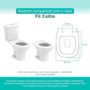 OBS.: O código 6LPF gravado na louça sanitária corresponde ao fluxo de água de uma descarga e não indica o modelo da mesma. RBN: Casa/Banho/Instalações e Acessórios de Banheiro/Vasos Sanitários e Peças/Assento de Vaso Sanitário | Conteúdo da Embalagem: 01 Assento Sanitário | Tipo: Assento Sanitário | Produto: Assento Sanitário | Site do Fabricante: | Marca do Assento Sanitário: Pontto Lavabo | : 6 meses contra defeitos de fabricação | Dica: Instalação: sem desmontar o produto, posicione sobre o vaso sanitário e encaixe os dois parafusos com as borrachas pretas dentro do furo do vaso. Aperte com a chave de fenda no sentido horário até ficar firme. | Para Vaso Sanitário do Modelo: Fit | Para vaso Sanitário da Marca: Celite | Cor: Branco | Tonalidade: Branco | Material do Assento Sanitário: MDF Laqueado | Instruções de Limpeza: Recomenda-se a limpeza com pano úmido e sabão neutro, não utilizar produtos abrasivos ou químicos | Almofadado?: Não | Peso do Produto: | Tipo de Fechamento: Fechamento Comum | Material da Fixação: Alumínio Anodizado | Precisa de baterias ou pilhas: Não | Regulamentações aplicáveis a produtos perigosos: Não aplicável | Código de certificação: Não aplicável | Ponto de Destaque01: Produzido em MDF Laqueado | Ponto de Destaque02: Ferragem em Alumínio Anodizado (não enferruja, não oxida) | Ponto de Destaque03: Possui 15cm de distância entre furos | Ponto de Destaque04: Produto vai completo, fácil instalação | Ponto de Destaque05: Pontto Lavabo | Termos de Pesquisa01: Assento Sanitário; Tampa de Vaso Sanitário; Fit Branco Celite; Fit 6lpf; Celite 6lpf | Quantidade de itens: 1 | Fonte de energia: Não aplicável | Dimensões da embalagem: Altura: 5cm x Largura: 40cm x Comprimento: 50cm | de caixas: 1