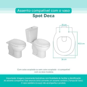 OBS.: O código 6LPF gravado na louça sanitária corresponde ao fluxo de água de uma descarga e não indica o modelo da mesma. RBN: Casa/Banho/Instalações e Acessórios de Banheiro/Vasos Sanitários e Peças/Assento de Vaso Sanitário | Conteúdo da Embalagem: 01 Assento Sanitário | Tipo: Assento Sanitário | Produto: Assento Sanitário | Site do Fabricante: | Marca do Assento Sanitário: Pontto Lavabo | : 6 meses contra defeitos de fabricação | Dica: Instalação: sem desmontar o produto, posicione sobre o vaso sanitário e encaixe os dois parafusos com as borrachas pretas dentro do furo do vaso. Aperte com a chave de fenda no sentido horário até ficar firme. | Para Vaso Sanitário do Modelo: Spot | Para vaso Sanitário da Marca: Deca | Cor: Branco | Tonalidade: Branco | Material do Assento Sanitário: MDF Laqueado | Instruções de Limpeza: Recomenda-se a limpeza com pano úmido e sabão neutro, não utilizar produtos abrasivos ou químicos | Almofadado?: Não | Peso do Produto: | Tipo de Fechamento: Fechamento Comum | Material da Fixação: Alumínio Anodizado | Precisa de baterias ou pilhas: Não | Regulamentações aplicáveis a produtos perigosos: Não aplicável | Código de certificação: Não aplicável | Ponto de Destaque01: Produzido em MDF Laqueado | Ponto de Destaque02: Ferragem em Alumínio Anodizado (não enferruja, não oxida) | Ponto de Destaque03: Possui 15cm de distância entre furos | Ponto de Destaque04: Produto vai completo, fácil instalação | Ponto de Destaque05: Pontto Lavabo | Termos de Pesquisa01: Assento Sanitário; Tampa de Vaso Sanitário; Spot Branco Deca; Spot 6lpf; Deca 6lpf | Quantidade de itens: 1 | Fonte de energia: Não aplicável | de caixas: 1 | Dimensões da embalagem: Altura: 5cm x Largura: 40cm x Comprimento: 50cm