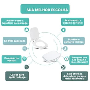 DIFERENCIAL * Possui calços que evitam o contato direto com a louça e que o assento deslize lateralmente. * Proporcionam maior estabilidade durante o uso. * Acabamento e encaixe perfeito no vaso sanitário. * Possui eixo entre as dobradiças, mantendo o assento sanitário firme na louça. * Sua ferragem metálica é super resistente e não oxida e nem enferruja.