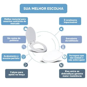 MATERIAL * Fabricado em Resina de Poliéster na cor Branca * É considerado o melhor material para assentos sanitários do mercado