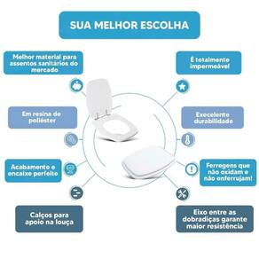 DIFERENCIAL * Possui calços que evitam o contato direto com a louça e que o assento deslize lateralmente. * Proporcionam maior estabilidade durante o uso. * Acabamento e encaixe perfeito no vaso sanitário. * Possui eixo entre as dobradiças, mantendo o assento sanitário firme na louça. * Sua ferragem metálica é super resistente e não oxida e nem enferruja.