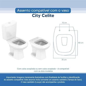 OBS.: O código 6LPF gravado na louça sanitária corresponde ao fluxo de água de uma descarga e não indica o modelo da mesma. RBN: Casa/Banho/Instalações e Acessórios de Banheiro/Vasos Sanitários e Peças/Assento de Vaso Sanitário | Conteúdo da Embalagem: 01 Assento Sanitário | Tipo: Assento Sanitário | Produto: Assento Sanitário | Site do Fabricante: www.ponttolavabo.com.br/ | Marca do Assento Sanitário: Pontto Lavabo | Garantia: 6 meses contra defeitos de fabricação | Dica: Instalação: sem desmontar o produto, posicione sobre o vaso sanitário e encaixe os dois parafusos com as borrachas pretas dentro do furo do vaso. Aperte com a chave de fenda no sentido horário até ficar firme. | Para Vaso Sanitário do Modelo: City | Para vaso Sanitário da Marca: Celite | Cor: Branco | Tonalidade: Branco | Material do Assento Sanitário: Poliéster | Instruções de Limpeza: Recomenda-se a limpeza com água e sabão neutro, não utilizar produtos abrasivos ou químicos | Almofadado?: Não | Peso do Produto: 2.98 | Tipo de Fechamento: Fechamento Comum | Material da Fixação: Alumínio Anodizado | Precisa de baterias ou pilhas: Não | Regulamentações aplicáveis a produtos perigosos: Não se aplica | Código de certificação: Não se aplica Ean: 7899983691960